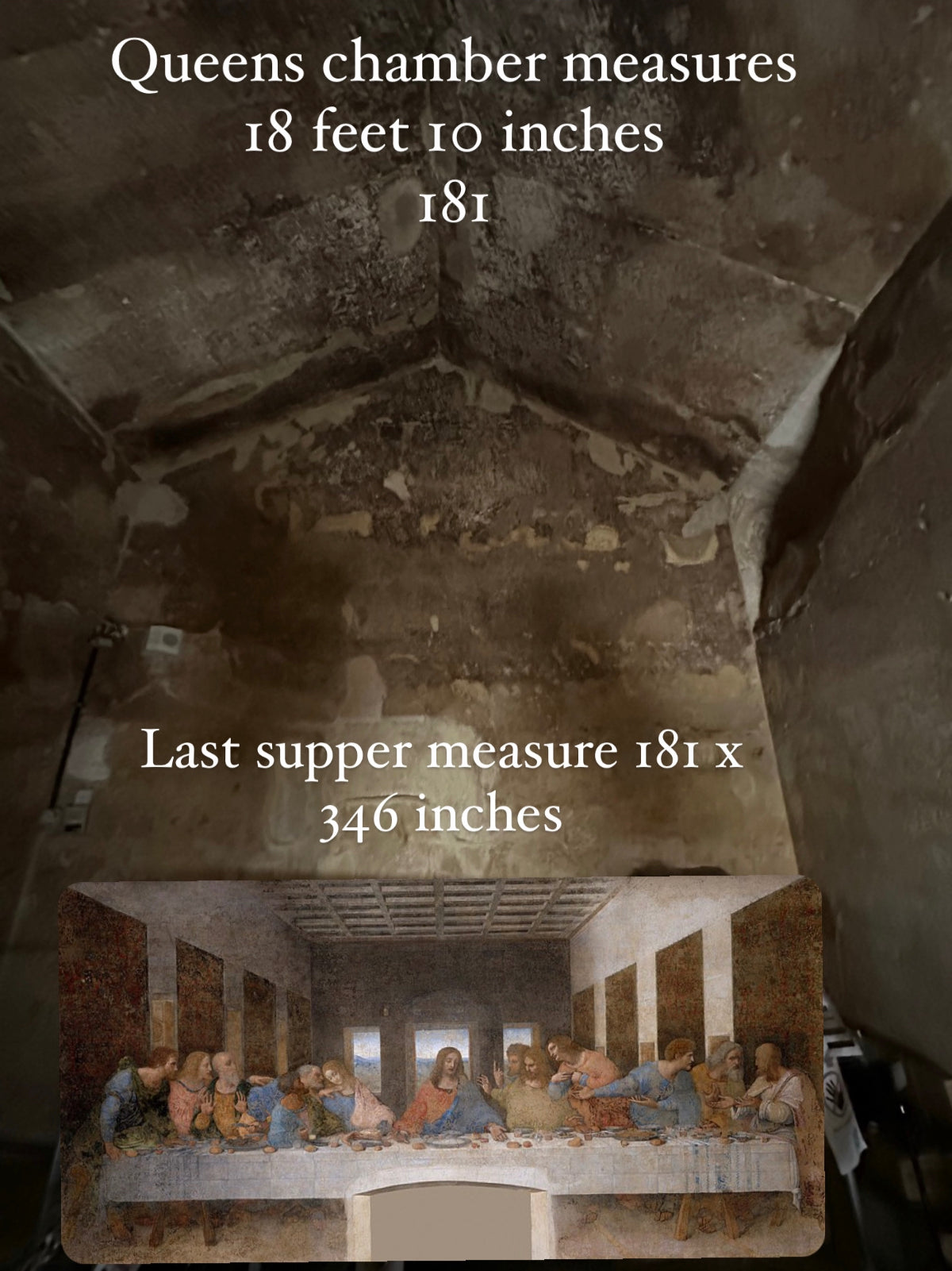 The last supper measures 181 x 346 inches, which can be found in the length of the Queen’s chamber 18 feet 10 inches (181).